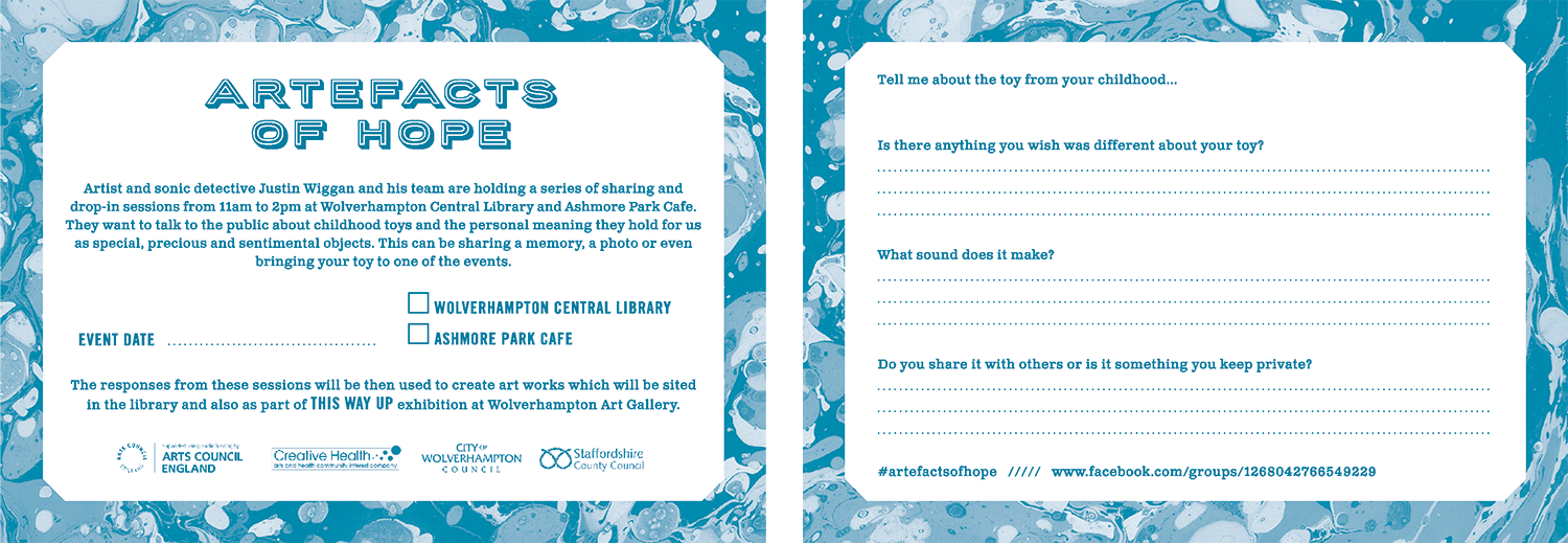 Supported by artists Priya Mistry, Carolyn Morton, Ildiko Nagy, Alice Thatcher and Jamila Walker, Justin collected personal stories from people at Wolverhampton Library and Ashmore Park Café about their beloved childhood toys, inviting people to complete a series of questions on specifically designed response cards. The responses people gave were honest and poetic and it seemed the questions tapped into positive emotional memories.